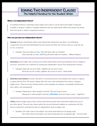 This handout addresses an issue of concern frequently challenging students and writers: joining two independent clauses with colons, commas, and semicolons.